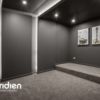 • Carpeted media room with tiered floor for raised seating and built-in entertainment unit.